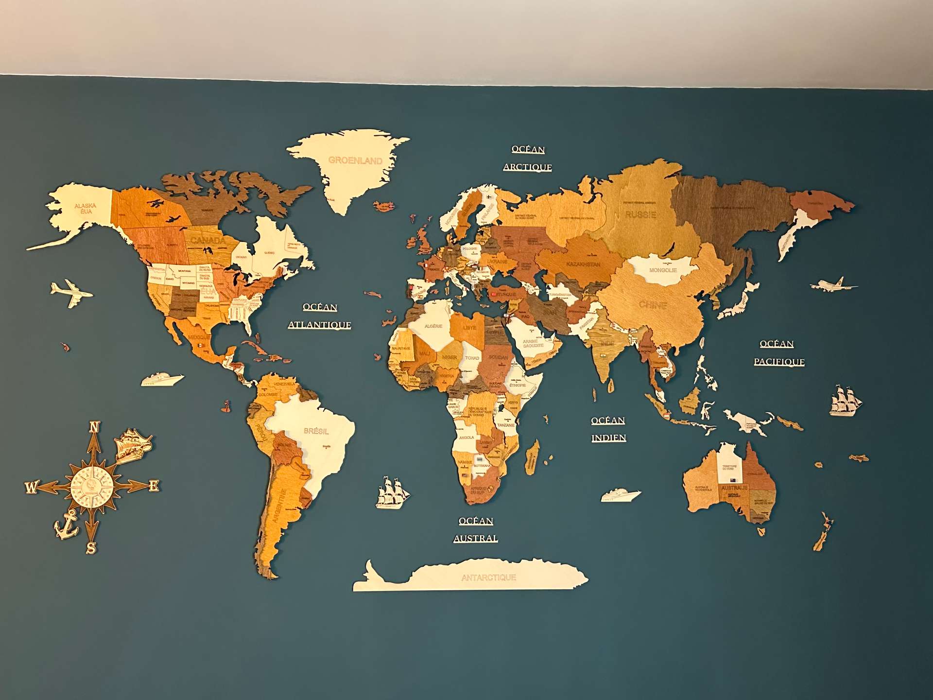 När vi installerade en av de första kartorna på vårt kontor var det roligt. En efter en limmade vi fast de enskilda kontinenterna och vi lekte också med placeringen av öarna. Redan då föreställde vi oss att det skulle finnas minst en av våra träkartor i varje enskilt land runt om i världen - vi är ju trots allt resenärer i våra hjärtan. Så här är ett galleri med kundfoton från hela världen.